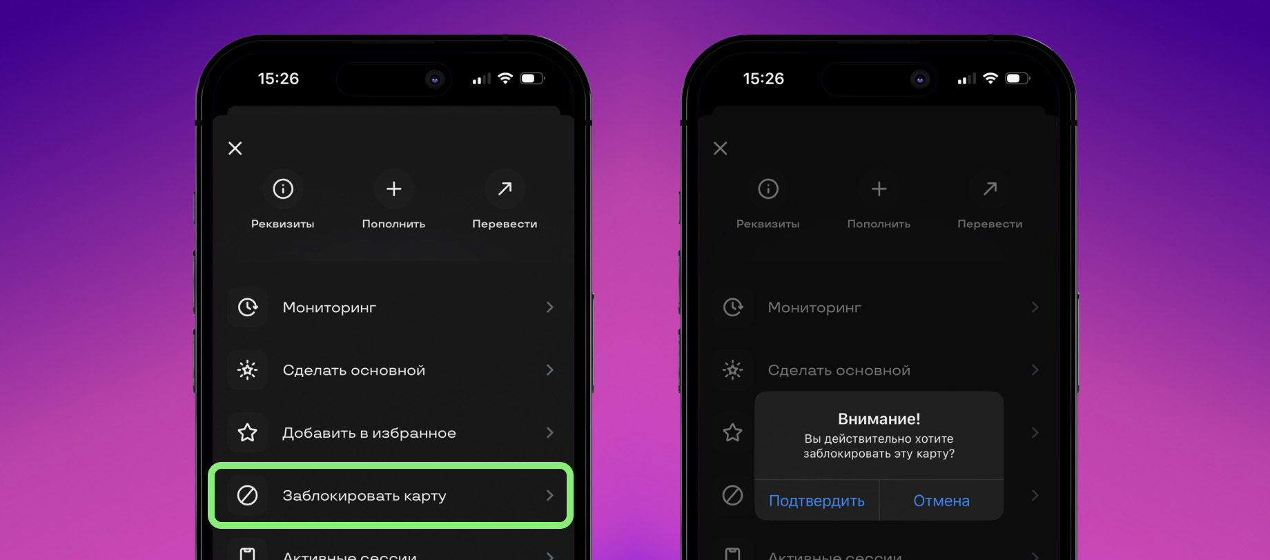 Если вы потеряли банковскую карту или её данные стали доступны мошенникам, которые, к примеру, пытались или даже сняли с неё деньги (о чём вы можете узнать благодаря подключённым СМС или пуш-уведомлениям), немедленно заблокируйте карту. Сделать это также можно онлайн, в личном кабинете или в приложении либо позвонив в банк.