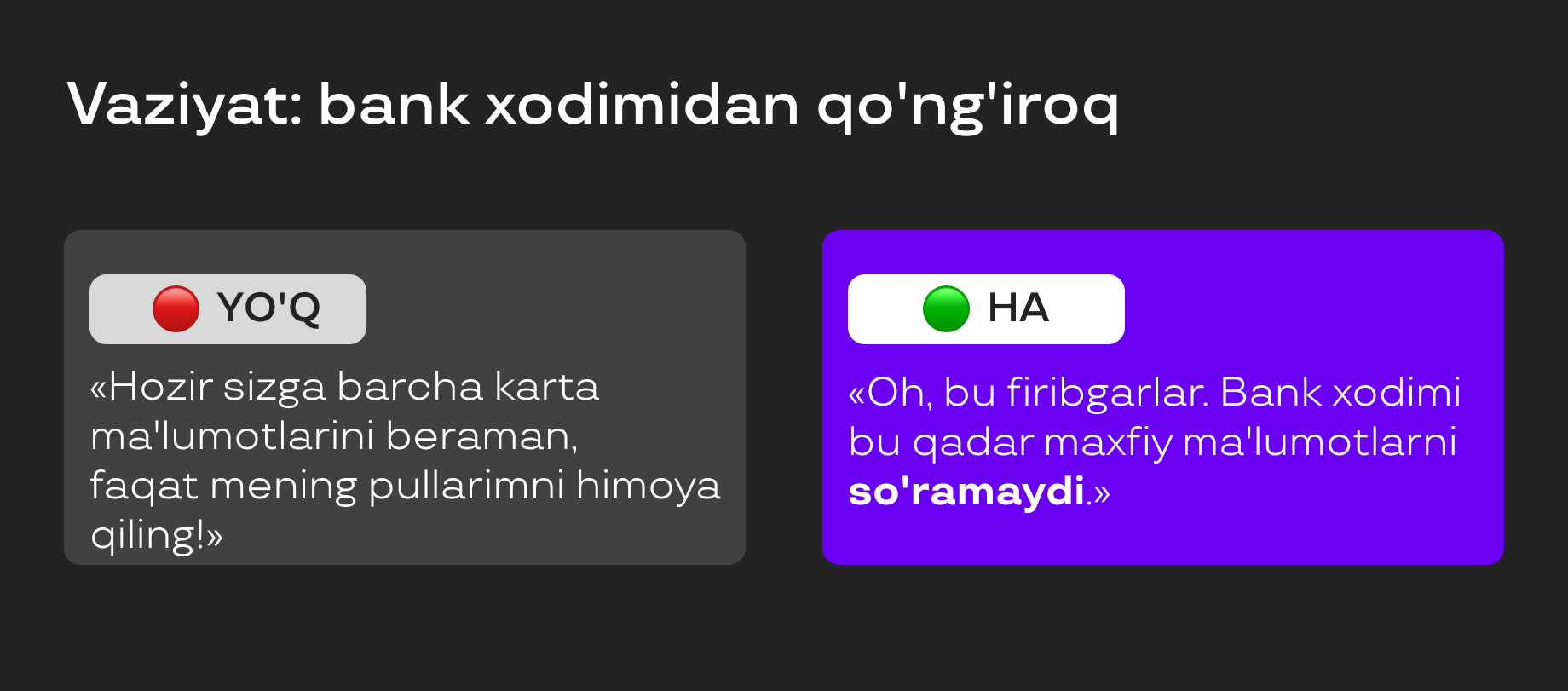 Bankdan haqiqiy xodimlar albatta sizga qo'ng'iroq qilishlari mumkin. Ammo ular hech qachon pasport ma'lumotlarini, kartaning amal qilish muddatini, CVV yoki CVC ni so'ramaydilar — ular suhbatlashish uchun allaqachon barcha kerakli ma'lumotlarga ega.
