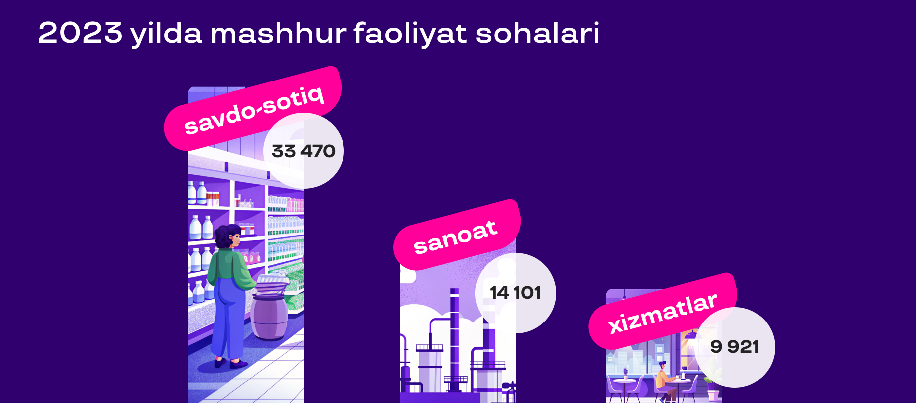 Tajribangiz va ishonchli hamkorlaringiz bo‘lgan sohada. Aksariyat tadbirkorlar savdoni eng oddiy va tushunarli biznes usuli sifatida tanlaydilar. 2023 yilda yangi tashkil etilgan kichik korxona va mikrofirmalardan 33 470 tasi aynan savdo bilan shug'ullangan, undan ikki barobar kam miqdori (14 101 kishi) sanoatda faoliyat yuritgan, undanam kamrog‘i (9 921 kishi) turli xil xizmatlar ko‘rsatgan.